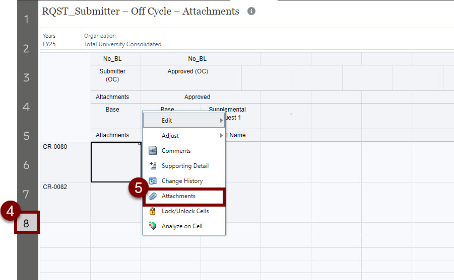 5. On a request created, select the empty "Attachment" cell and right click on it, Select "Attachments".