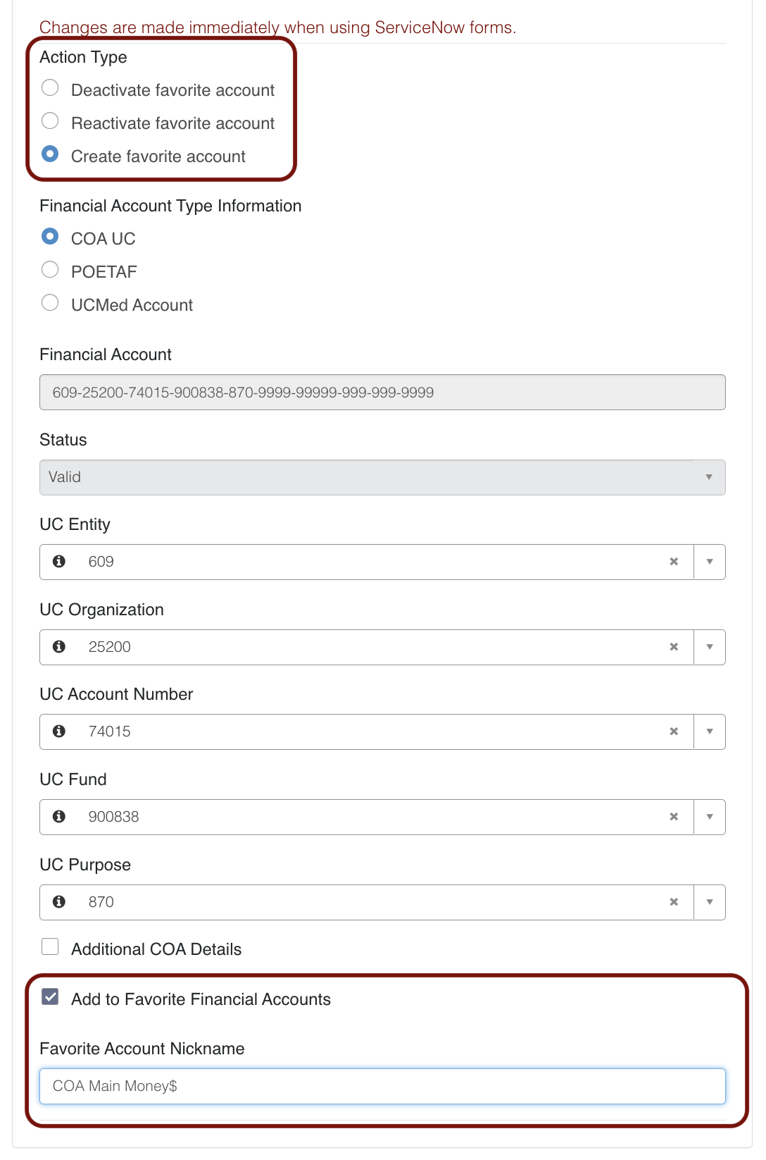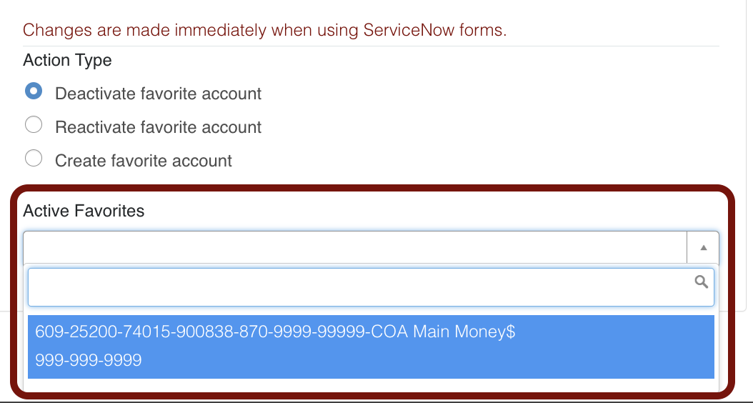 - Manage Favorite Financial Accounts for ServiceNow Forms appears.