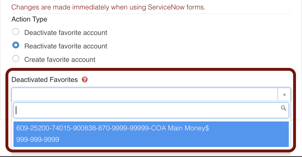 Maintaining a list of your frequently used financial accounts makes filling out ServiceNow forms requesting Oracle Cloud data quicker and easier; your account information is saved and ready for use immediately. Instead of filling out every Account Information field, you can select your favorite account from the drop-down and auto-fill the financial account section of the form.