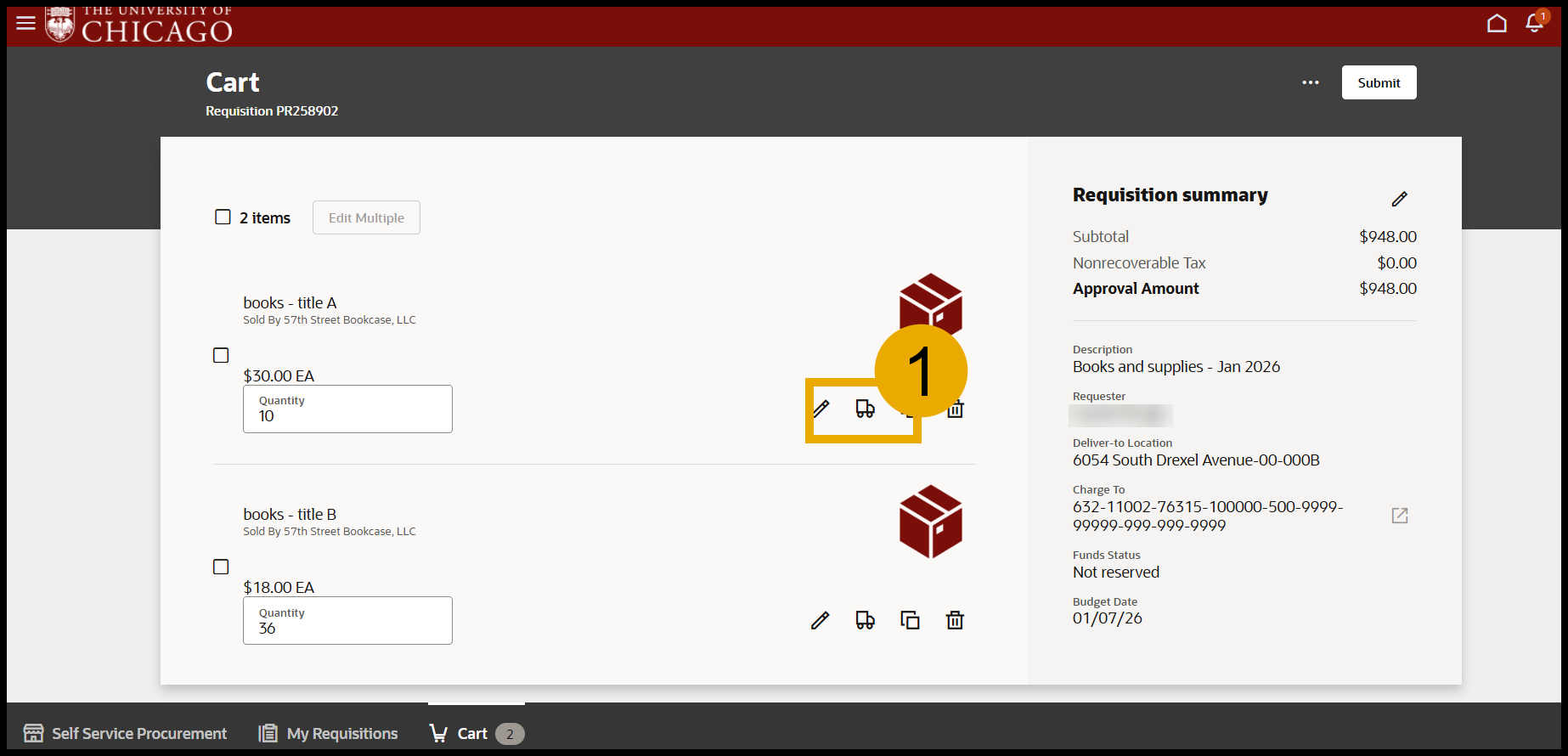 - After all the items have been added to Cart, select the Truck Icon of the line item that needs to have a split distribution.