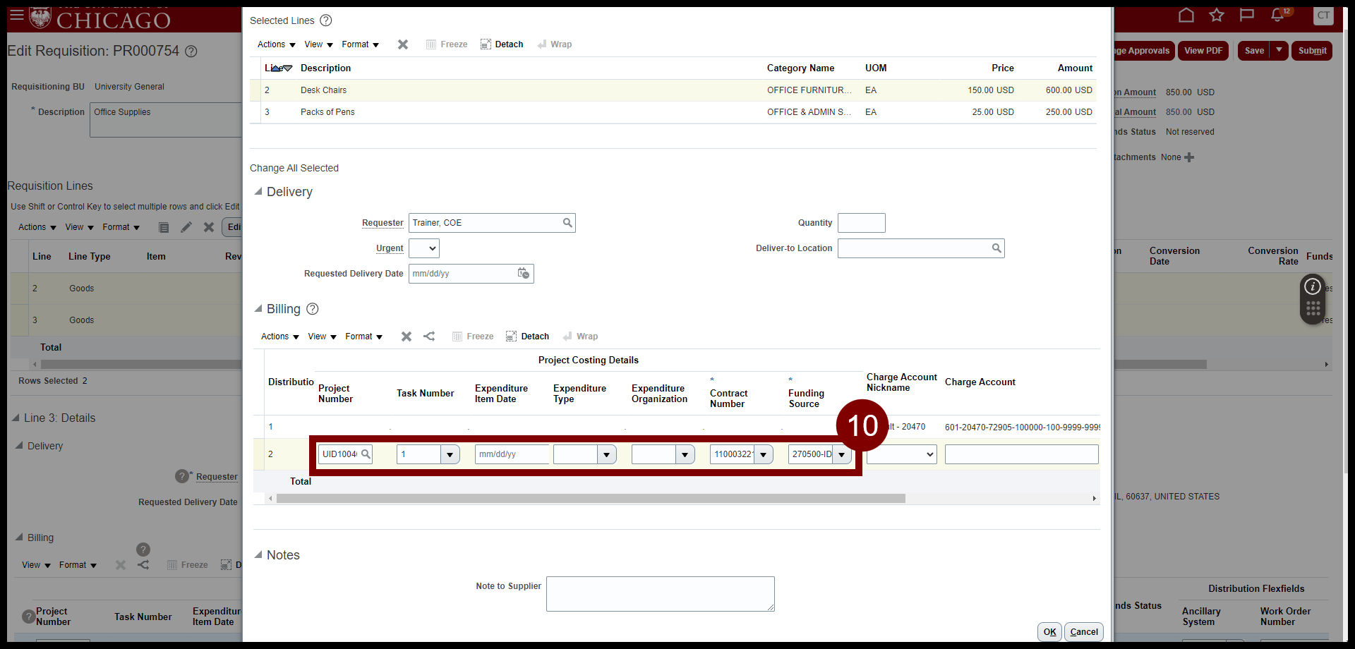 - For each line, add in the POETAF information, use the dropdown to select a COA from your favorite list, or type in the COA you want to charge.