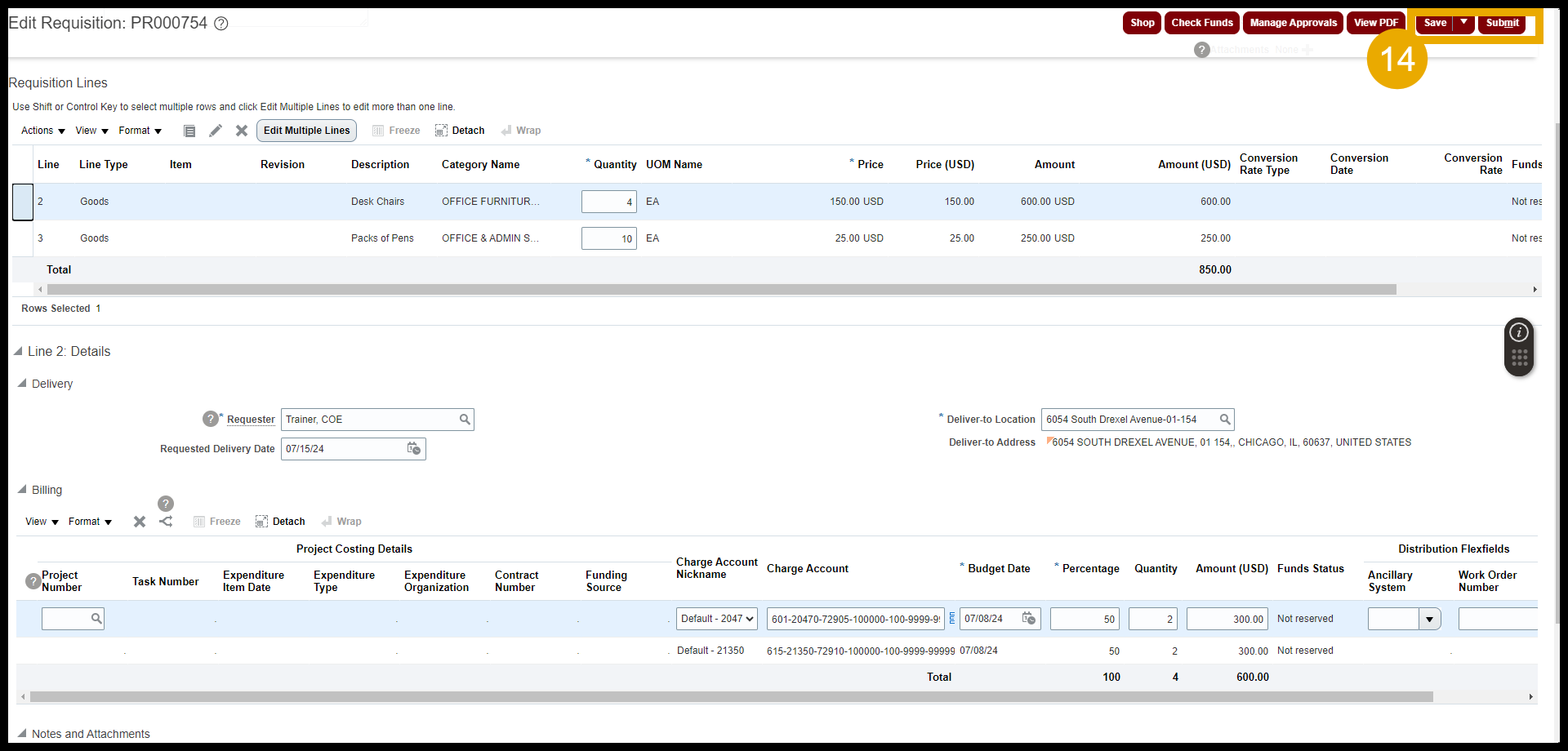 - Select one of the Requisition Lines. Select the Shift Key and select the other line(s).