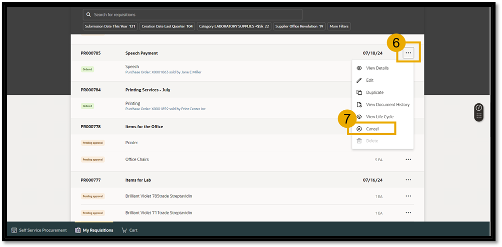 - Select the Three Dots on the requisition that needs to be cancelled.