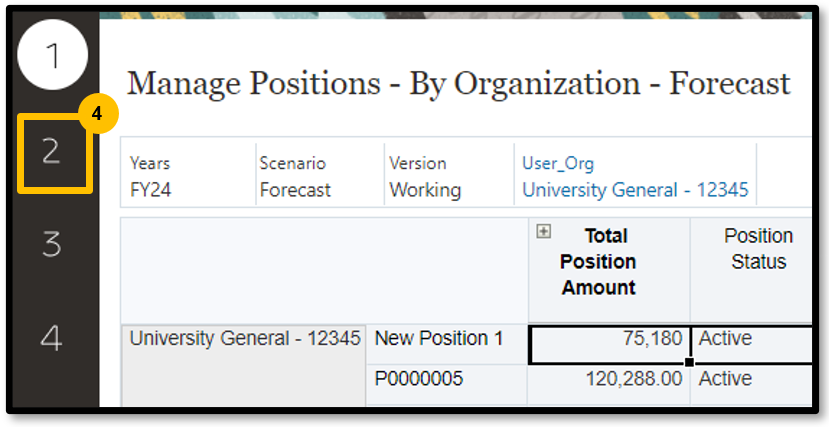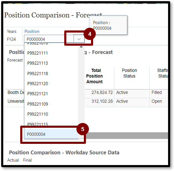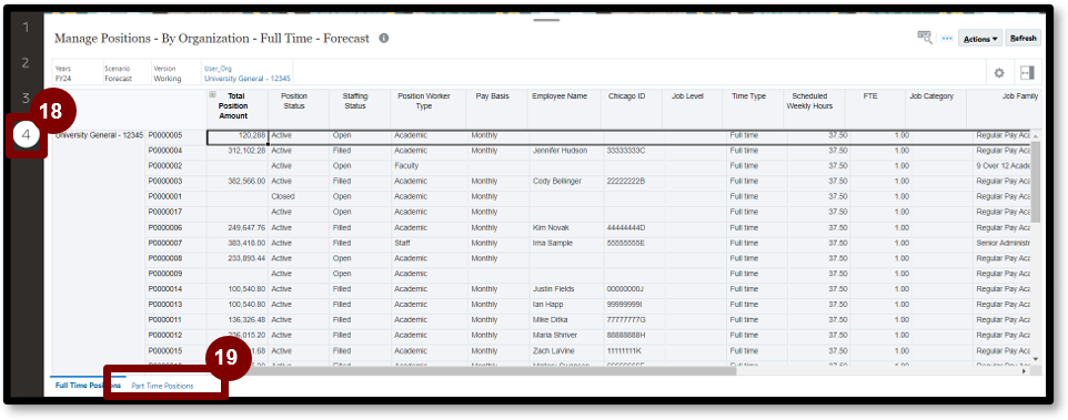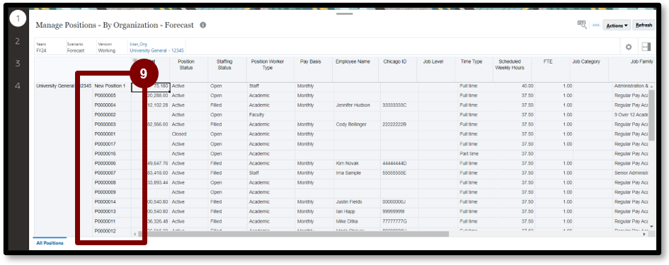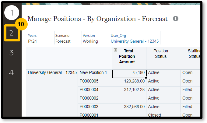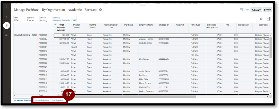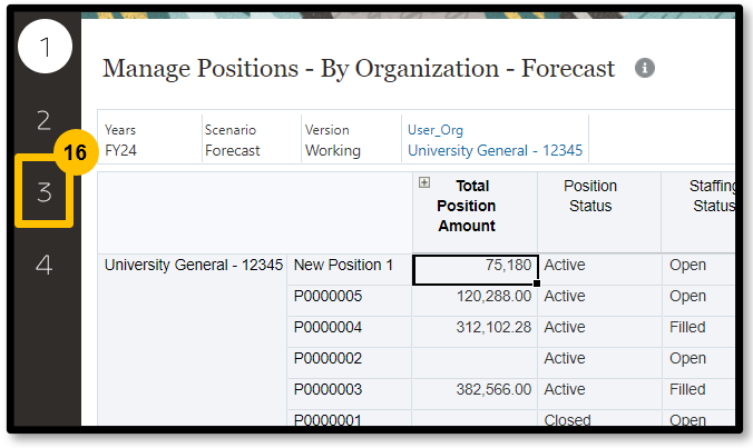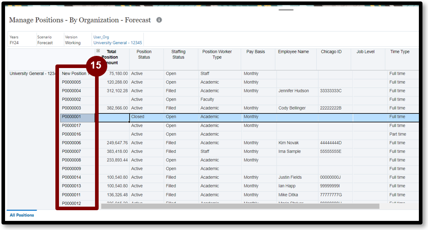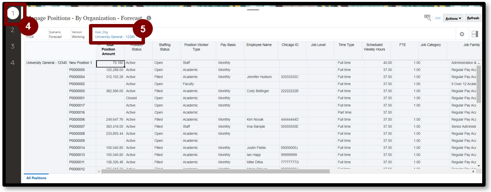 4. Select 1 on the left-side of the page. This page displays individual positions loaded from Workday.