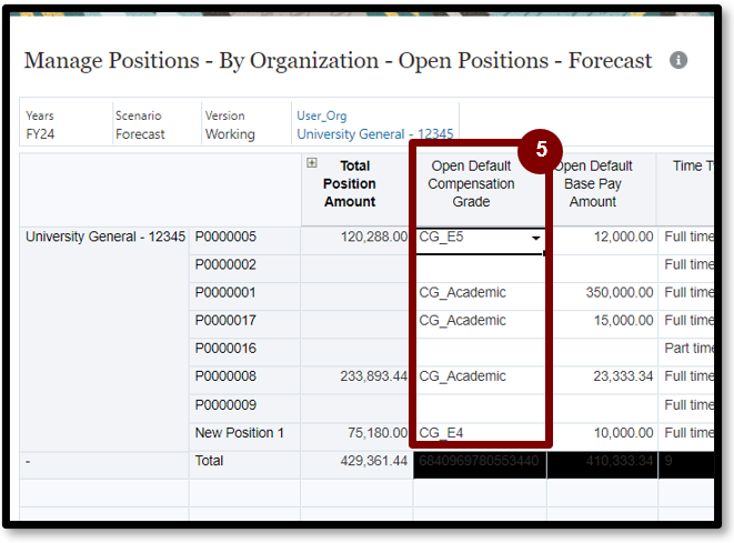 5. To calculate an open position - select or update the open default compensation grade by clicking on the drop-down arrow in the Open default Compensation Grade column for a position.