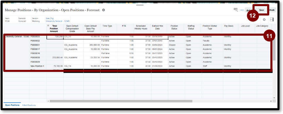 11. Enter or adjust data for each position (each row) as needed.