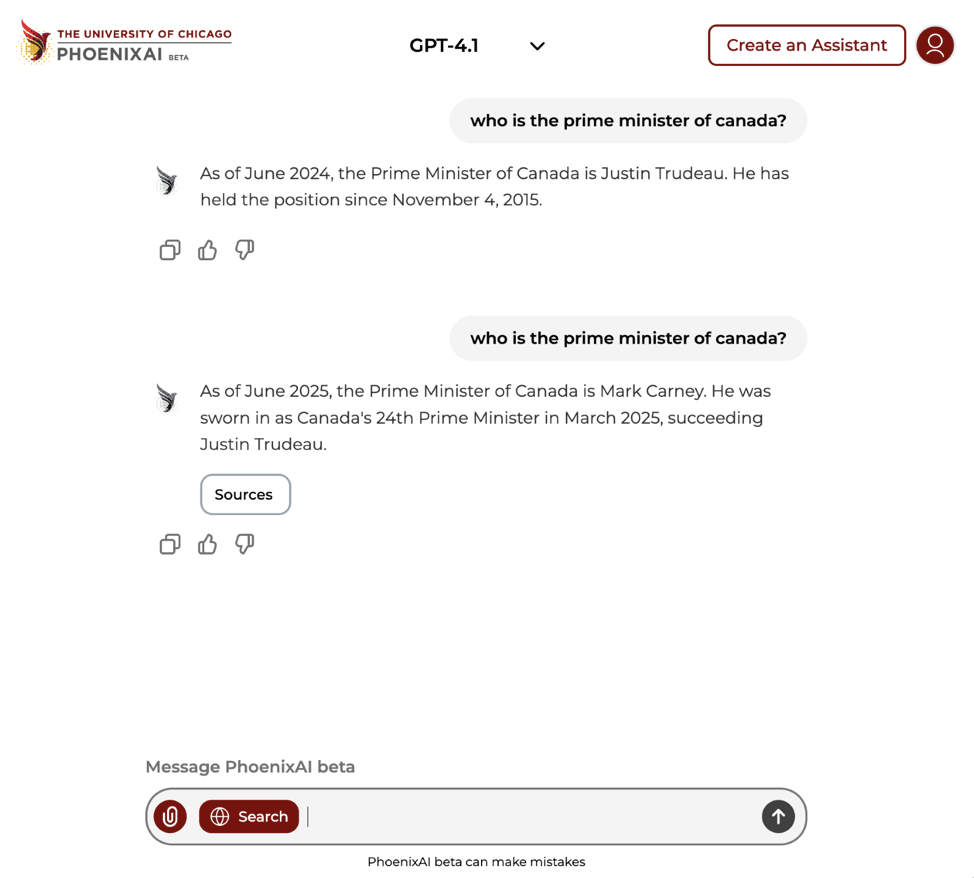 PhoenixAI now includes an Internet Search feature that allows the assistant and individual chats/threads to access up-to-date information. When this option is disabled, responses are based only on existing knowledge and may not include recent events. When enabled, the assistant can search the web to provide more current answers, including clickable source links showing where the information came from. An assistant creator can turn off Internet searches from their Assistant to focus searches only on internal knowledge and uploaded knowledge files.