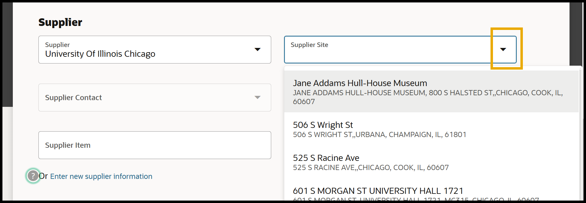 If a Supplier Site does not populate, open the dropdown to select the appropriate one. Requisitions without a Supplier Site will be automatically rejected.
