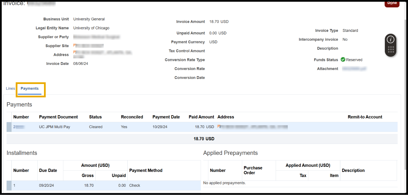 Select the Invoice Number listed under Related documents to find payment details. The Payments section lists: