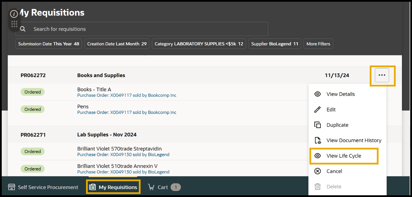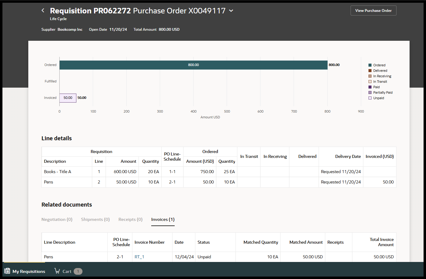 The requester can view the life cycle of the requisition in Oracle. The life cycle information includes the Purchase Order, invoice(s), and payment information.