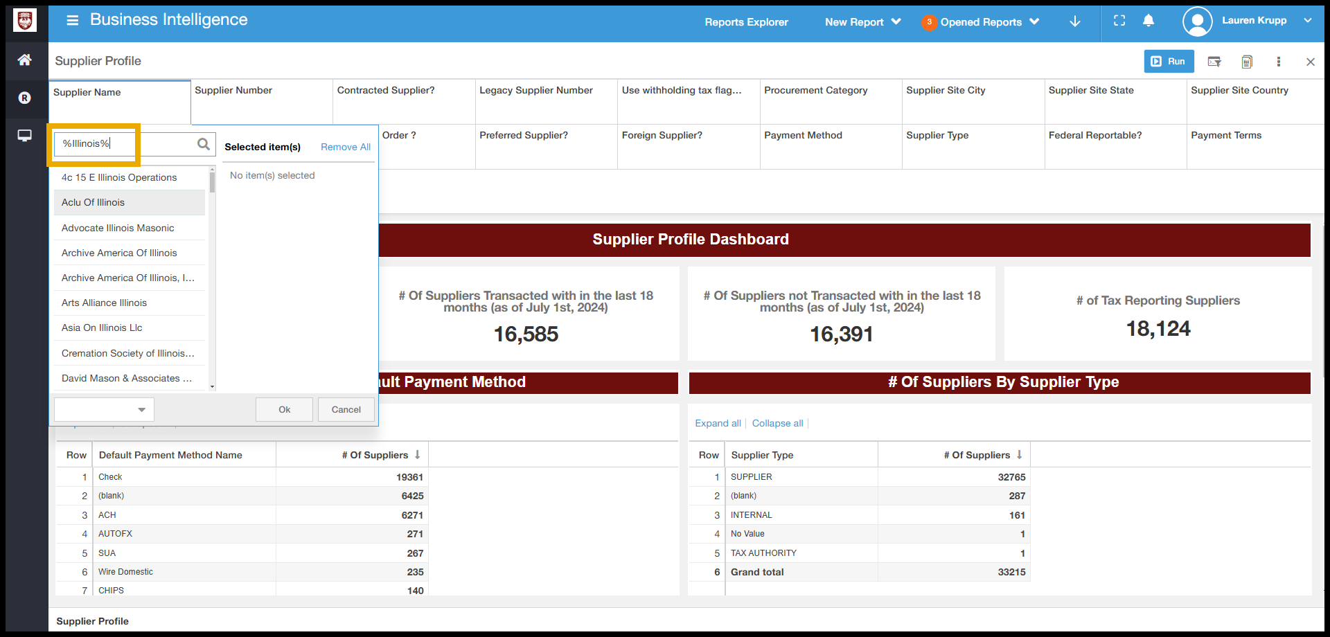 In Orbit’s Supplier Profile Report, search for potential suppliers by using the filters. If you only know part of a supplier’s name, use the percentage sign (%) at the start and end.
