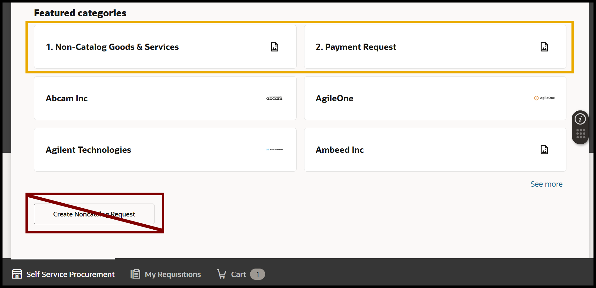 If you are creating a non-catalog or payment request requisition, select the appropriate tile listed under Featured categories. Do not select the Create Noncatalog Request option. Choosing that will not allow you to input the requisition information and direct you back to the Self Service Procurement homepage.