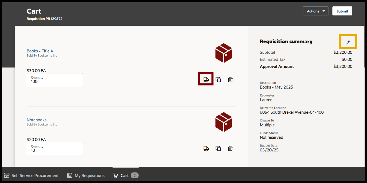 After adding all items to the chart, you can edit the COA and/or POETAF information that is defaulted onto the requisition based on the requisition preferences. To change the distribution information for all lines, select the pencil icon on the Requisition summary (noted in the yellow box). To change the distribution information for a specific item, select the truck icon (noted in the red box).