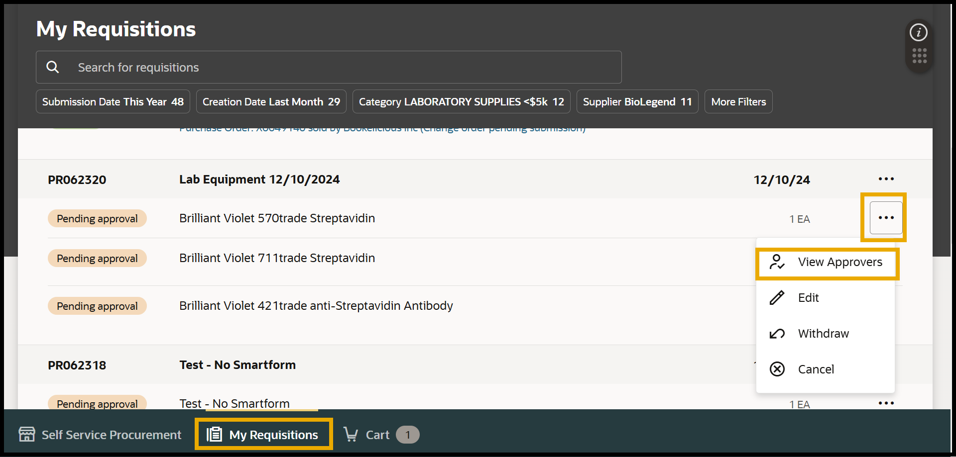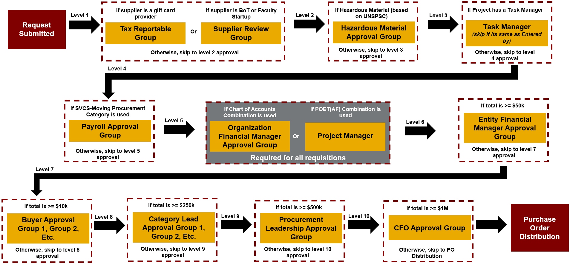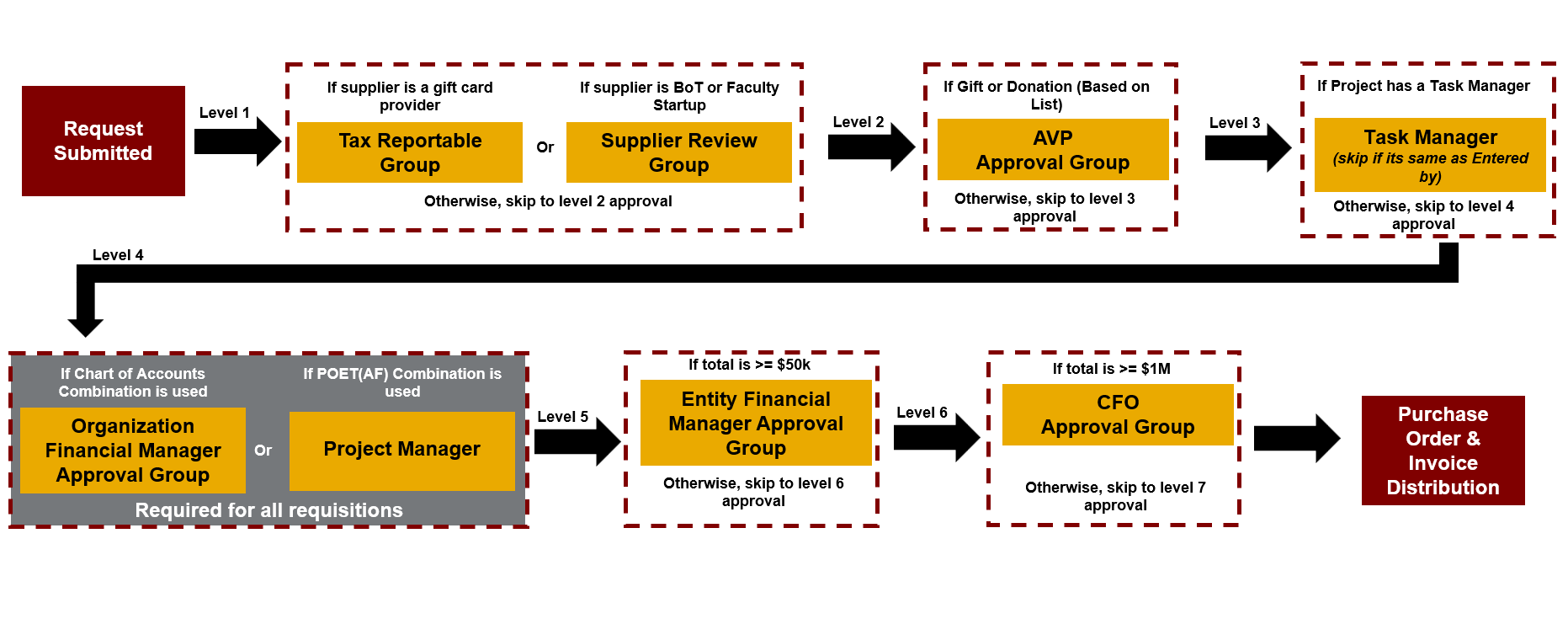 Once requisitions are submitted, it will be added to the approval workflow. At minimum all requisitions will be reviewed by the Organizational Financial Manager Approval Group for requisitions using Chart of Account segments or a Project Manager for requisitions using POETAF.