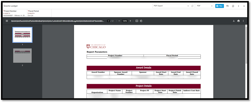 Note: This report functions differently than the other reports in Orbit. When you select the filter criteria, the user needs to select Run. After running this report, a .pdf will appear. Users can select the download icon to download the .pdf and provide the document to external auditors.