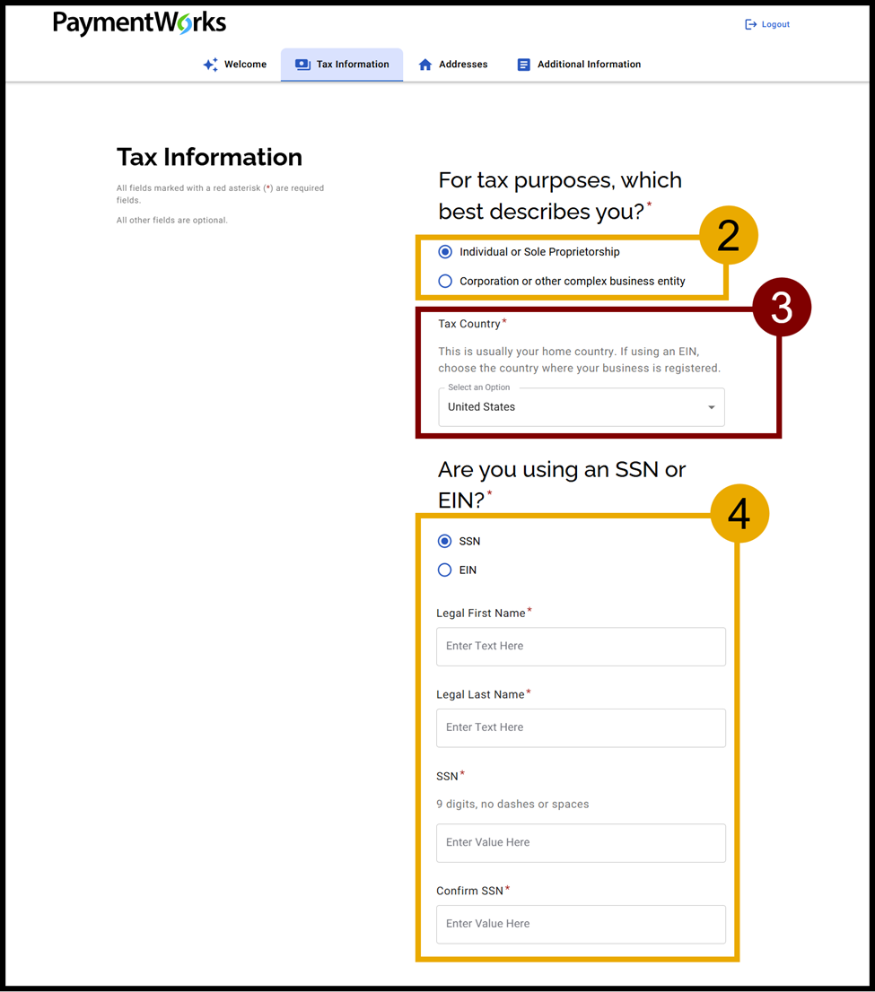 The below guide represents the PaymentWorks application as of February 2025. The application is subject to change. Depending on your responses, the application may appear slightly different than the guide. Please make sure to complete all required fields.
