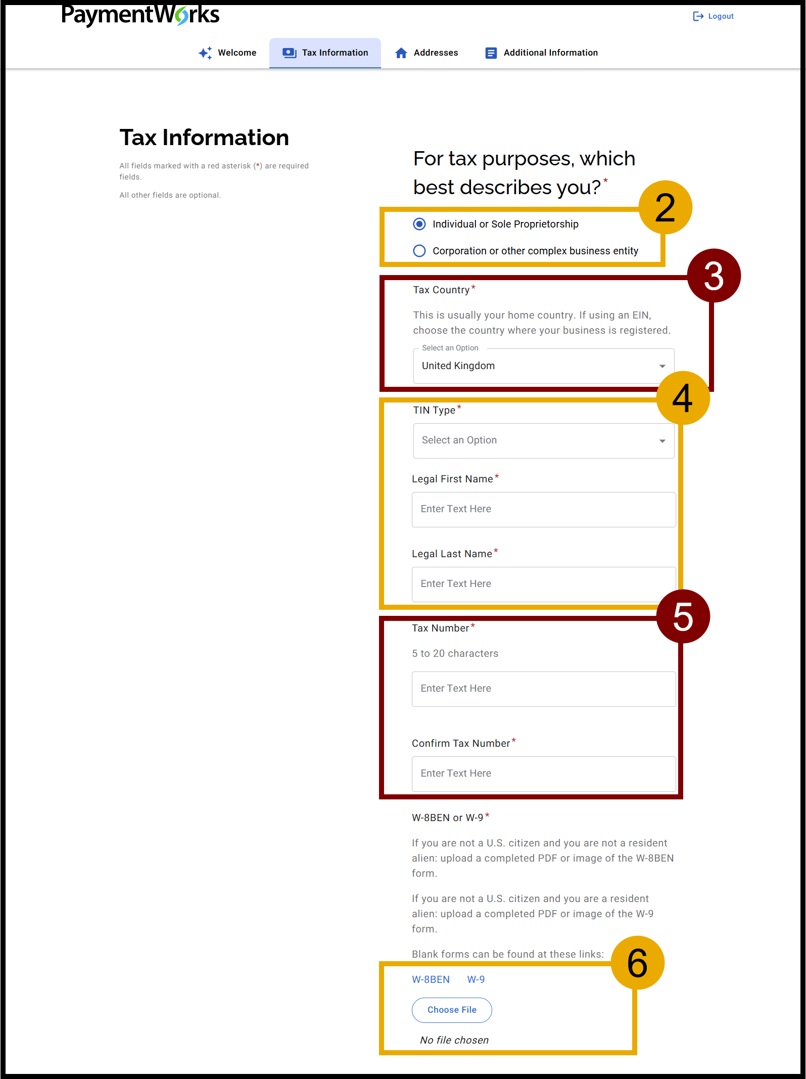 - The first section will be Tax Information. Select whether you are an Individual or Sole Proprietorship or Corporation or other complex business entity. This guide will demonstrate Individual or Sole Proprietorship. Select the appropriate choice and fill out the required information.