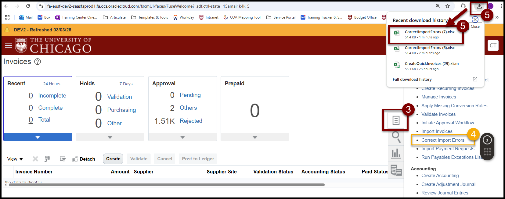 - Spreadsheet Upload Errors: These are Errors that prevent an Invoice that was created in a Spreadsheet from uploading to Oracle. Until these errors are corrected, the Invoice will not appear in the Manage Invoices section in Oracle. Here is a link that shows you How To Search For and Correct Spreadsheet Upload Errors.