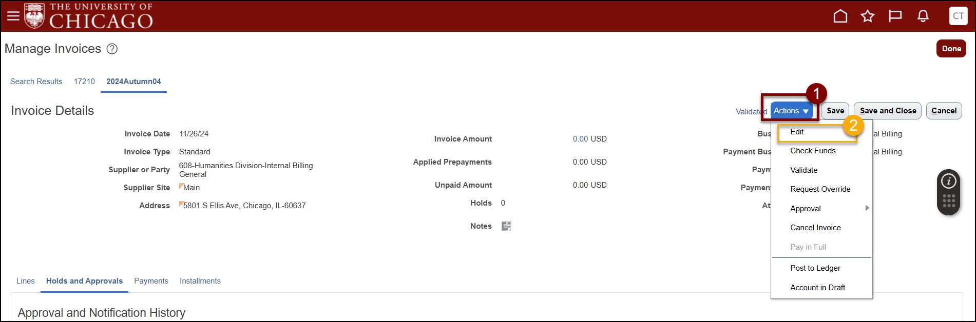 - Approval Queue - If the invoice is in an approvers queue (i.e. a Project Manager), you will not be able to edit the invoice. If changes need to be made, the best practice is to reach out to the approver and ask them to Reject the invoice.