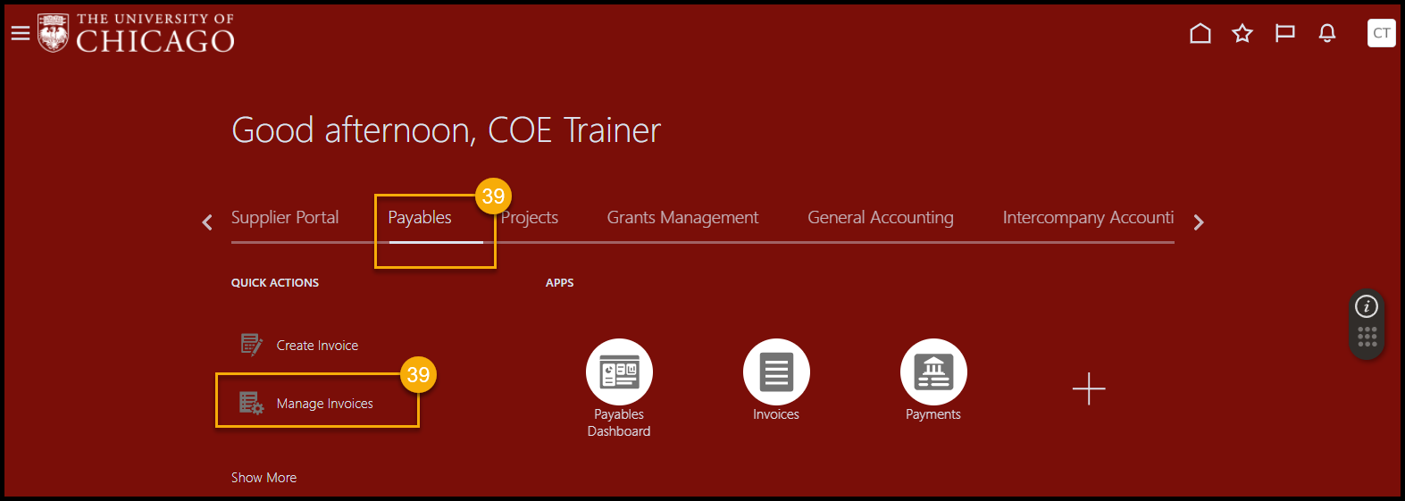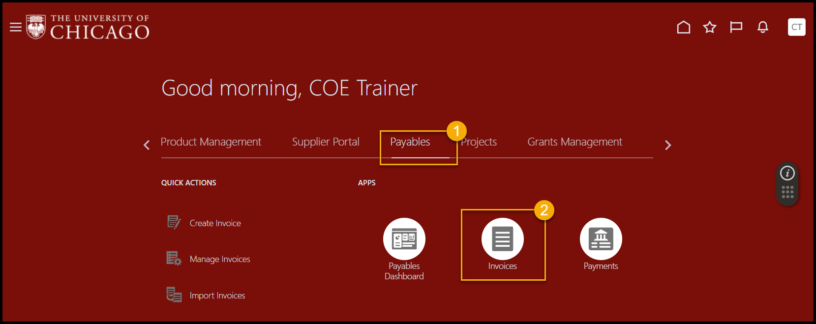 - Once you have verified the invoices have been imported, you may navigate to Manage Invoices within the Payables module to view the invoices and confirm if any additional verification steps need to be taken.