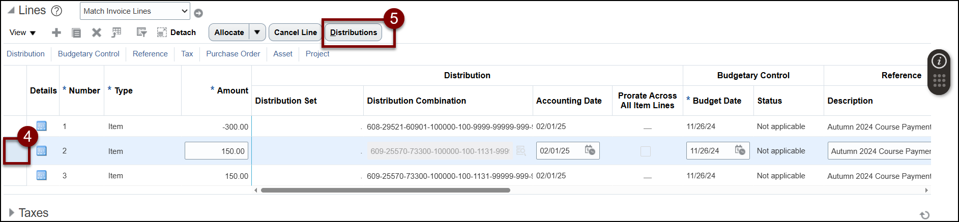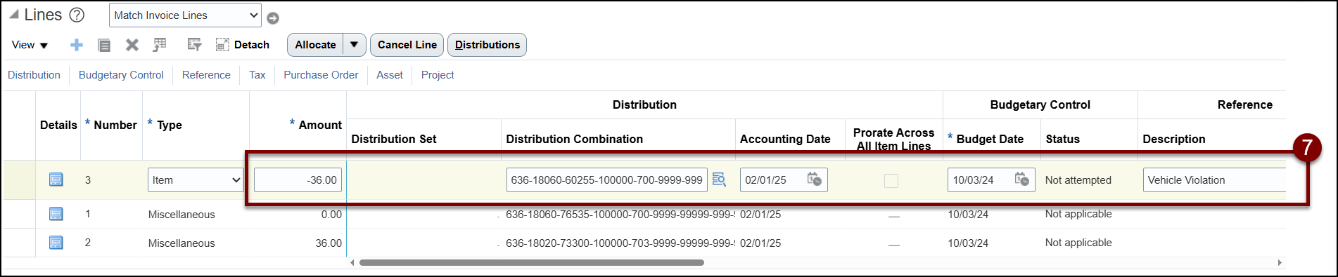 - Note: If you forget to highlight the line, you will get an error message that states: This invoice action isn't applicable for the invoice distribution in its current state.