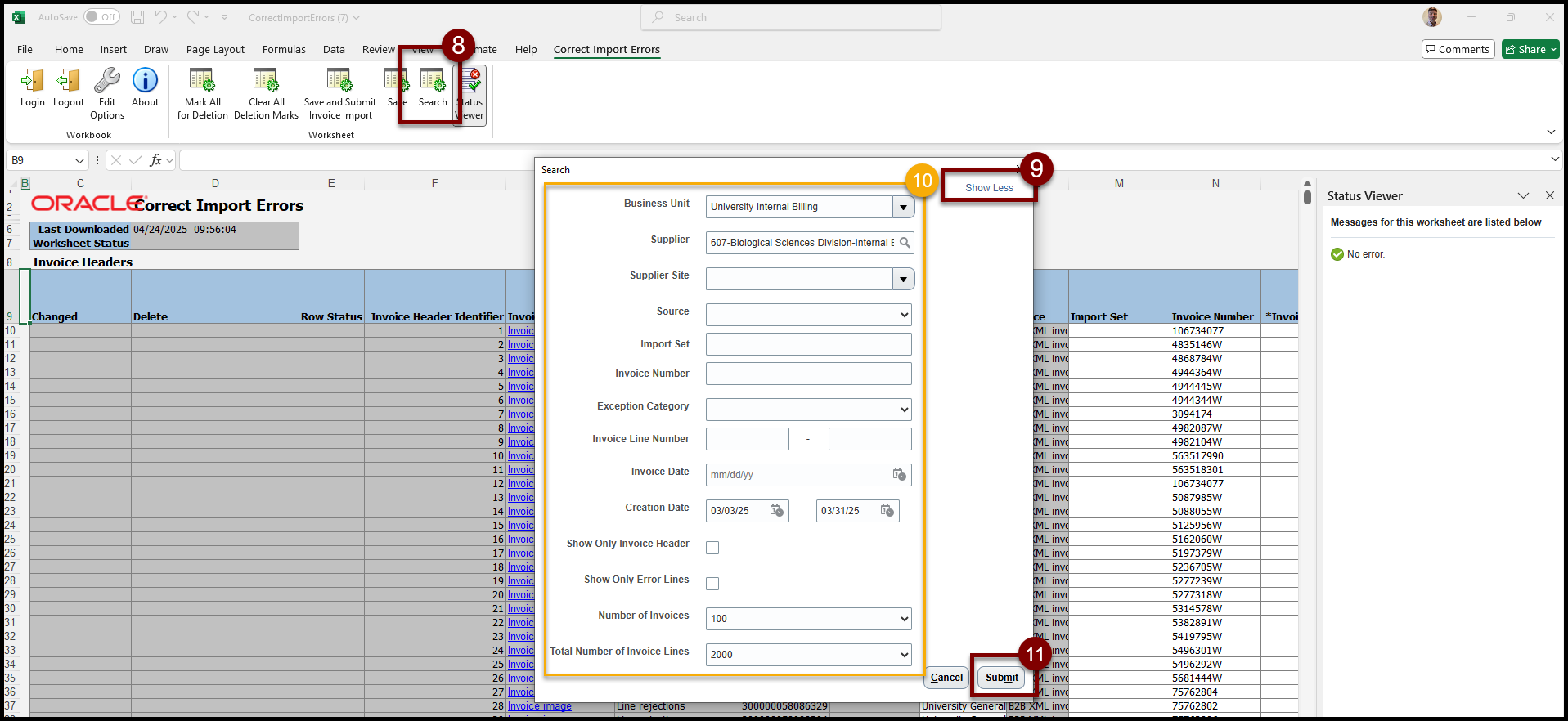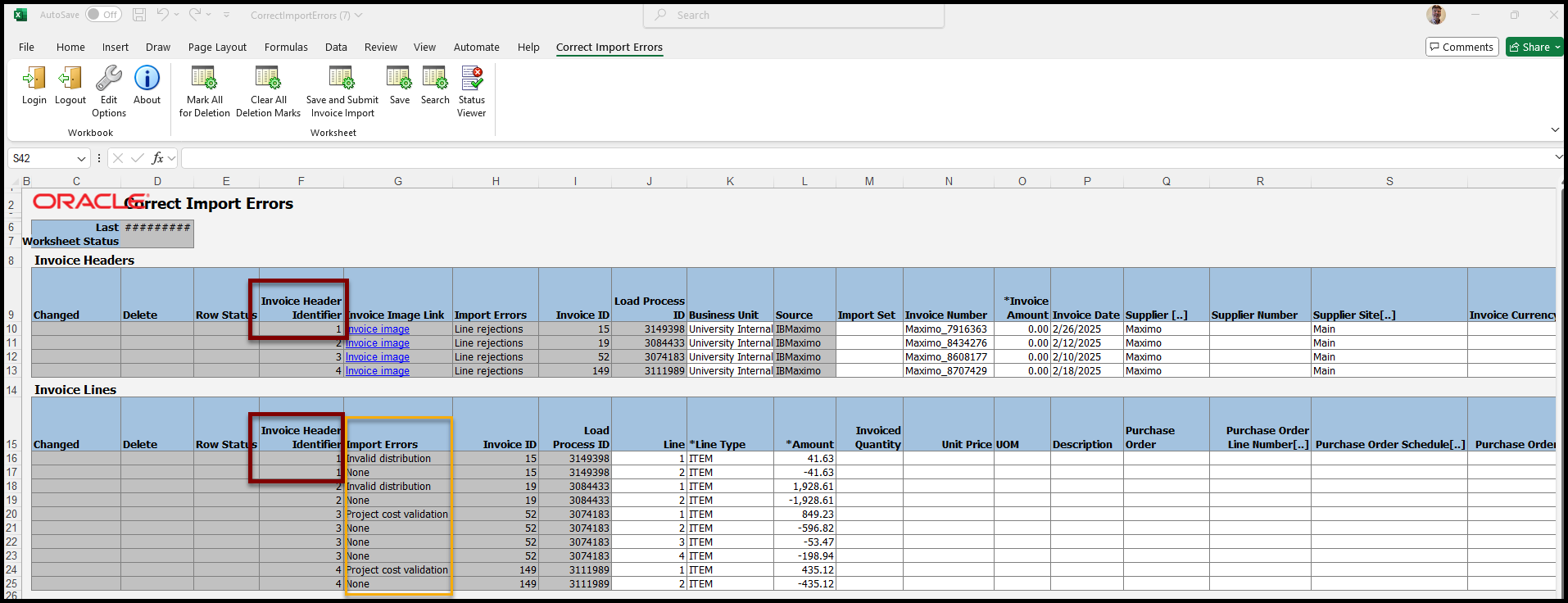 - Invoice Headers (top): There is one Row for each Invoice that failed to import into Oracle. The Import Errors column (Column H) indicates what type of error caused the Invoice to fail.