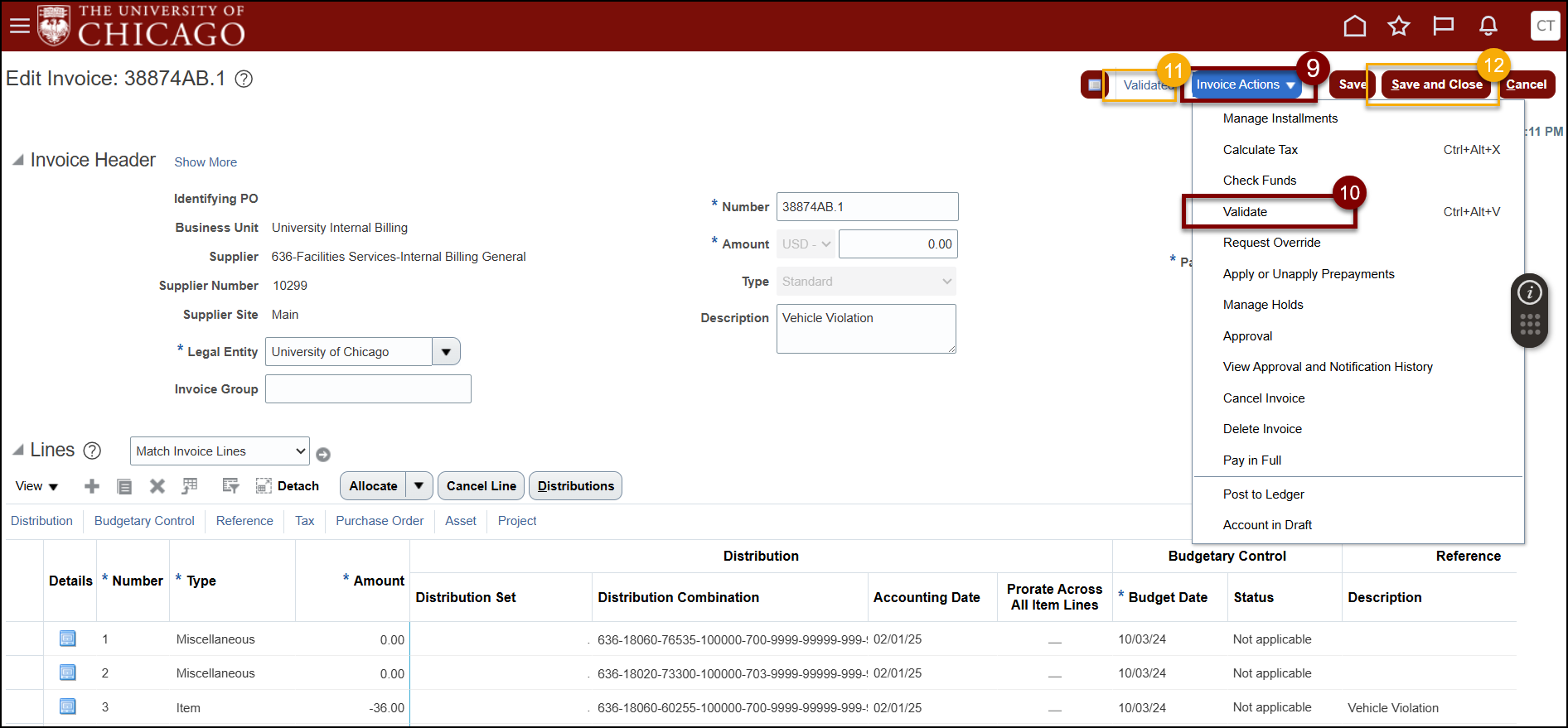 Once you have identified the error, follow these steps to correct the error(s) by editing the Distributions. You can also make edits by Cancelling Invoice Lines that are incorrect and entering new lines.