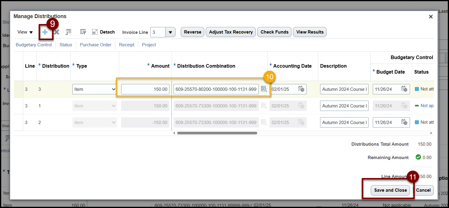 - Enter the correct Line Information in the newly created Line (Amount, Distribution Combination, etc.).