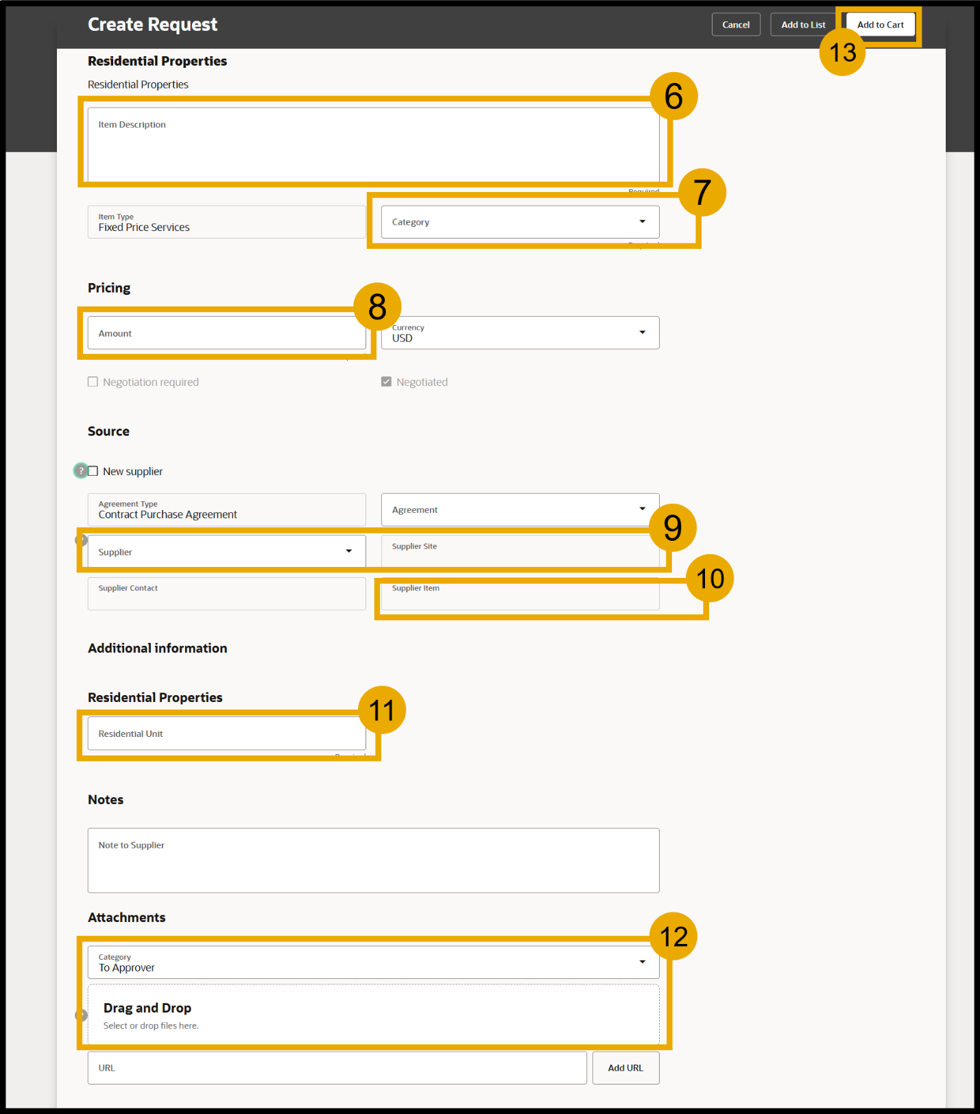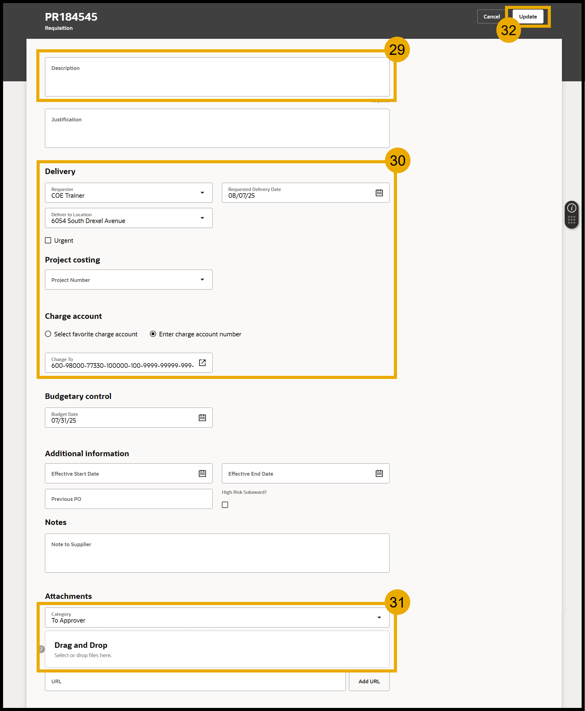 - Add any supporting documentation for the line item. Review the required documentation standards. The Attachment Category should read To Approver. If the supplier also needs a copy of the attachment, change the Attachment Category to To Supplier and upload the document again.