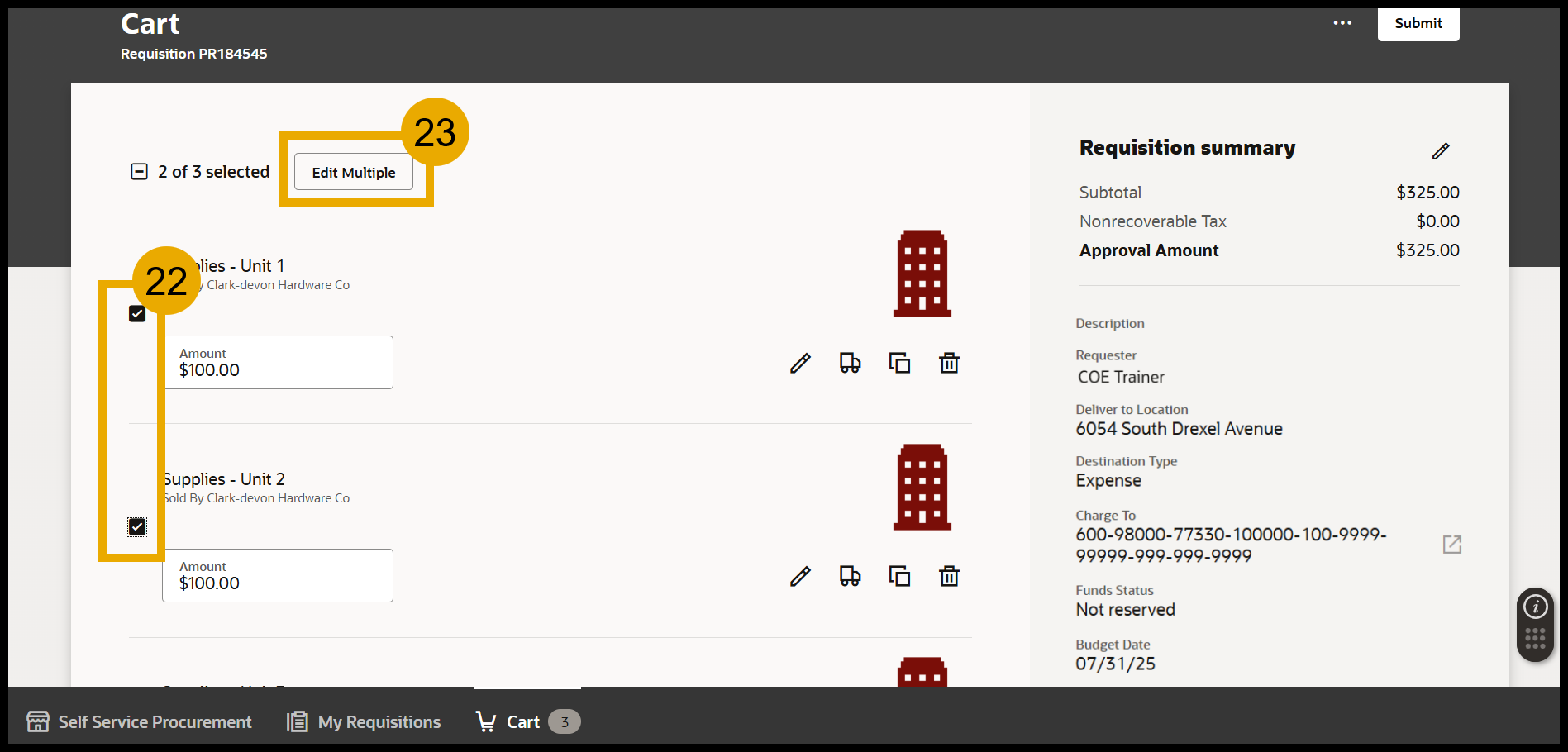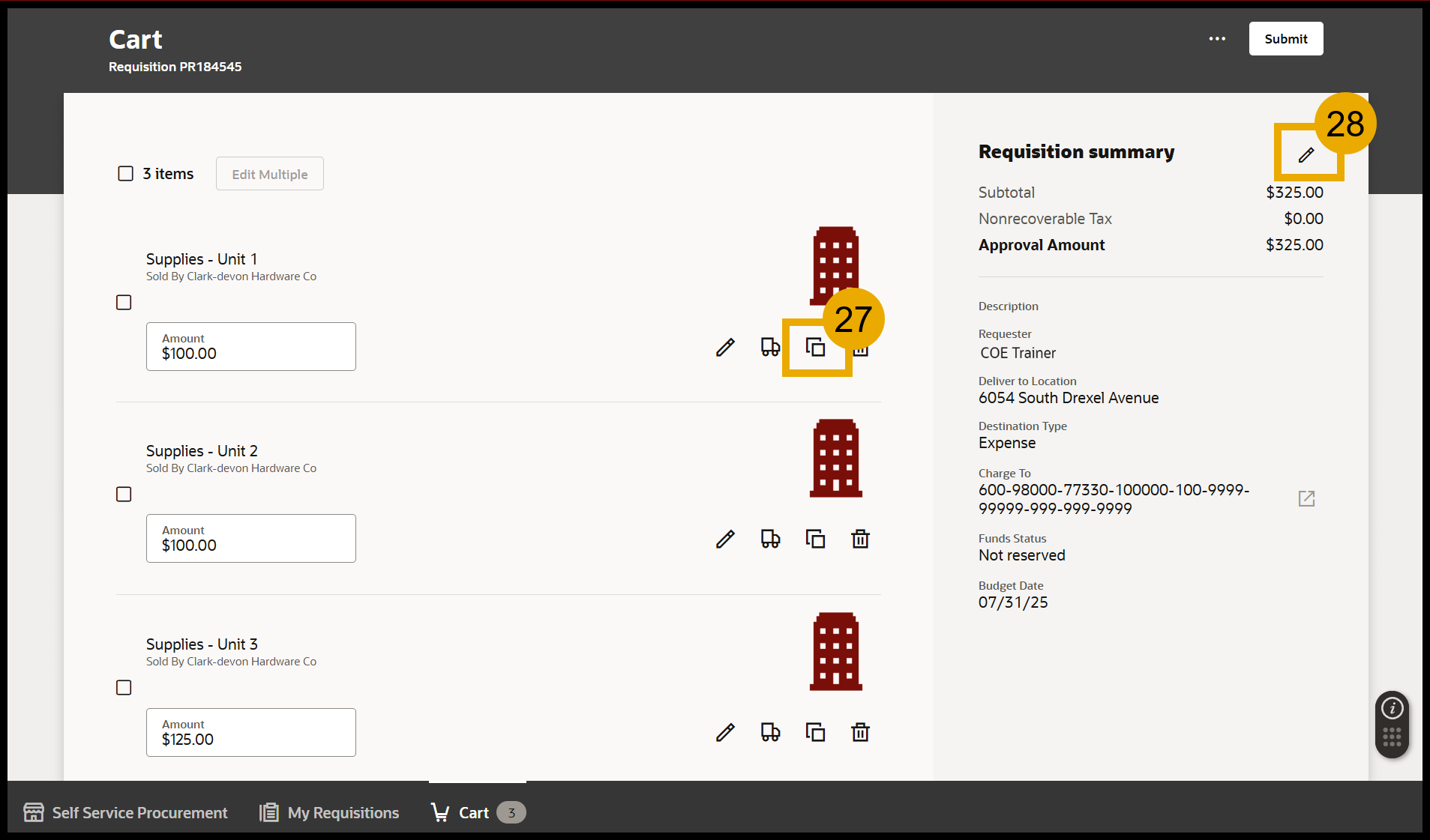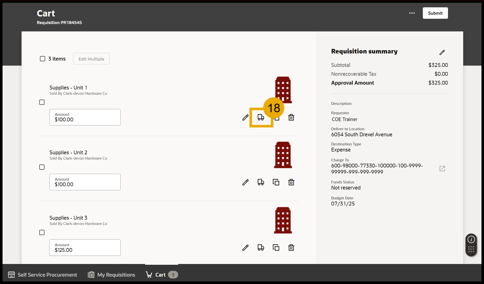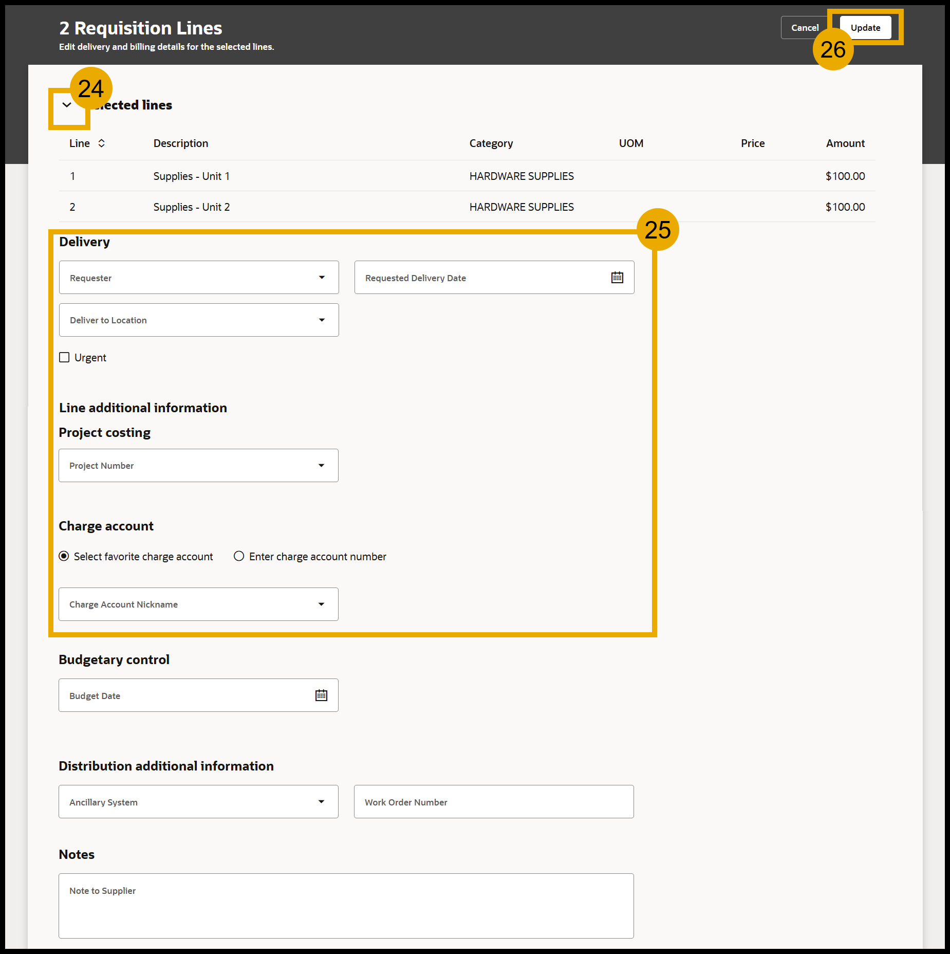 - If needed, edit the delivery and/or distribution information. Edits made here will apply to all requisition lines.