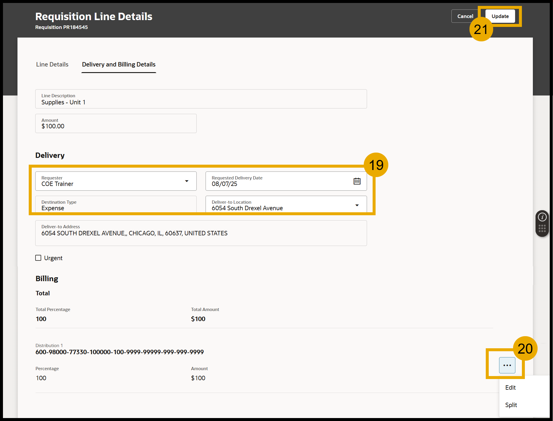 - To change the distribution information, select the three dots and choose either Edit or Split. This will only change the distribution information of the specific line item. Review the Creating a Split Distribution in Oracle guide for more information.