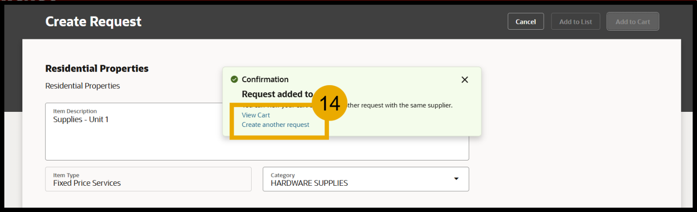 - If more items need to be added, select Create another request. Once all items have been added, select View Cart.