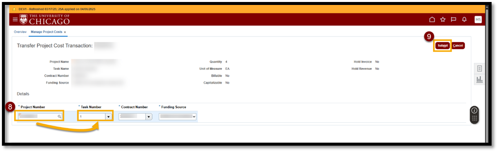 - Target Project Number: The Project Number to which the cost is transferring.