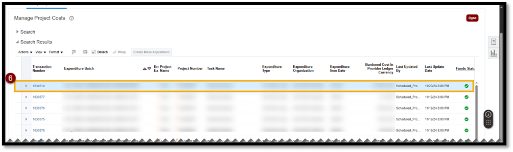 - Select the Transaction Number noted during step 7 of the Complete Cost Transfer process.
