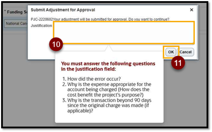- As a requirement for the cost transfer process, you must enter the following details in the justification box: