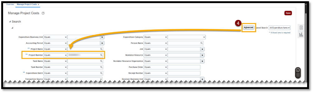 - Select Advanced in the Search section. Enter one of the Project Numbers to which you removed the cost.