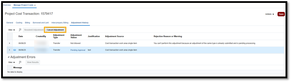 - Canceled: The Adjustment is canceled. You can cancel only pending or rejected adjustments of any type, except rebuilding burden costs and updating project and task organizations.