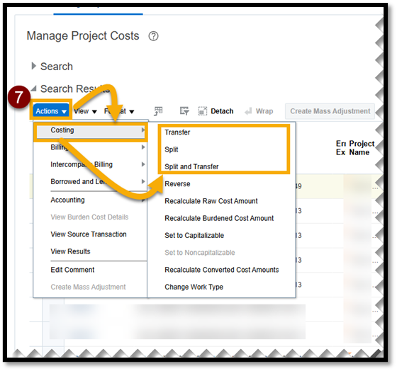 - Note the Transaction Number(s) for your records. Select Actions, choose Costing and then select either Transfer, Split, or Split and Transfer.