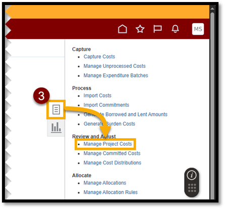 - Select the Tasks icon and choose Manage Project Costs.