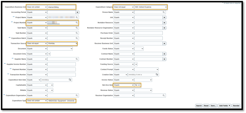 - Expenditure Type: Switch the search condition to Does not contain and enter 19626-EQU: Equipment - University Owned