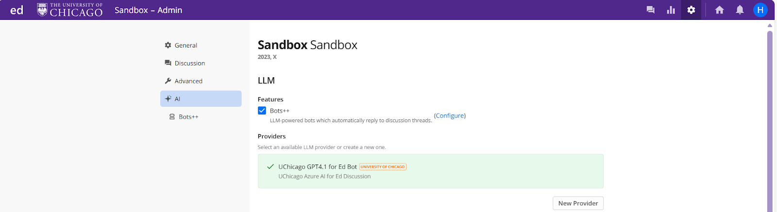 Under LLM Provider, select a specific LLM for this bot or leave it set to the course default. To manage available providers, select the here link.