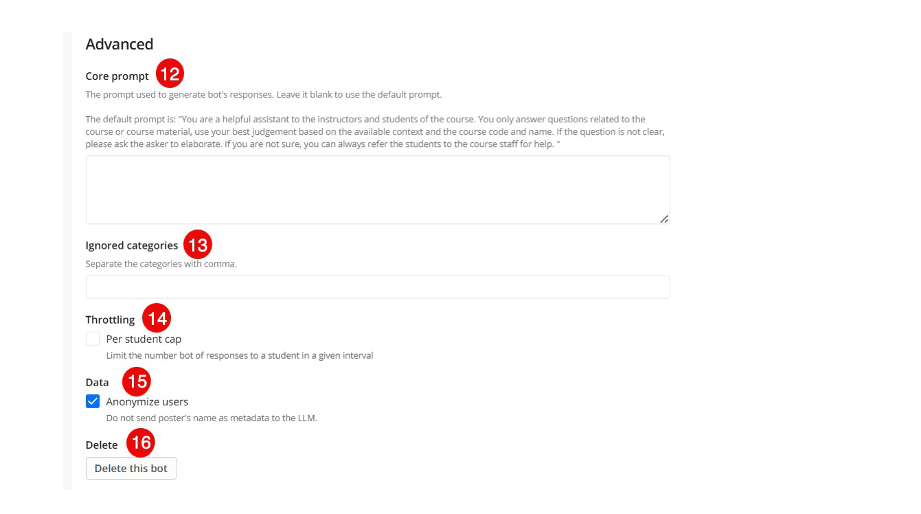 The Customization section helps the bot better understand your course context to improve the relevance of its responses.