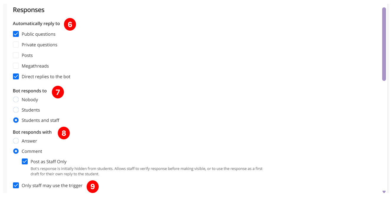 Under Bot responds with, choose how the bot delivers its response — as an Answer or a Comment. If you select Comment, you can enable Post as Staff Only, which hides the bot's response from students until staff review and make it visible, or use it as a draft for their own reply.