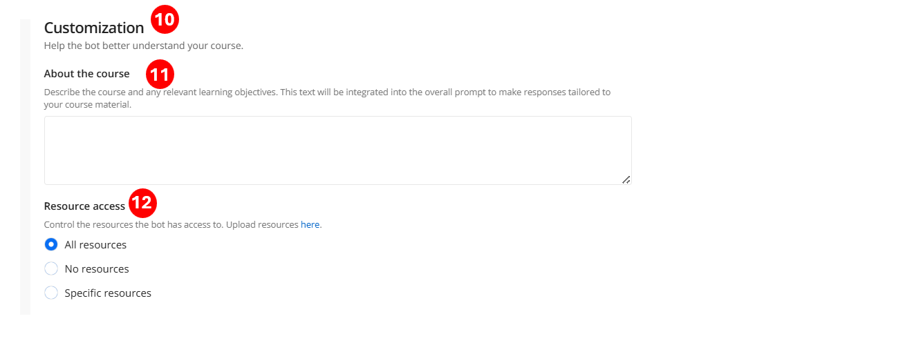 Under Resource access, control which uploaded resources the bot can draw from when responding. Select All resources, No resources, or Specific resources to limit access to particular files. To upload resources, select the here link.