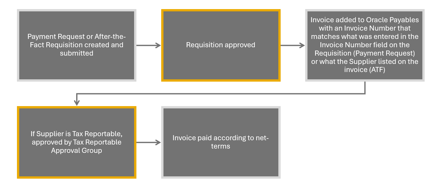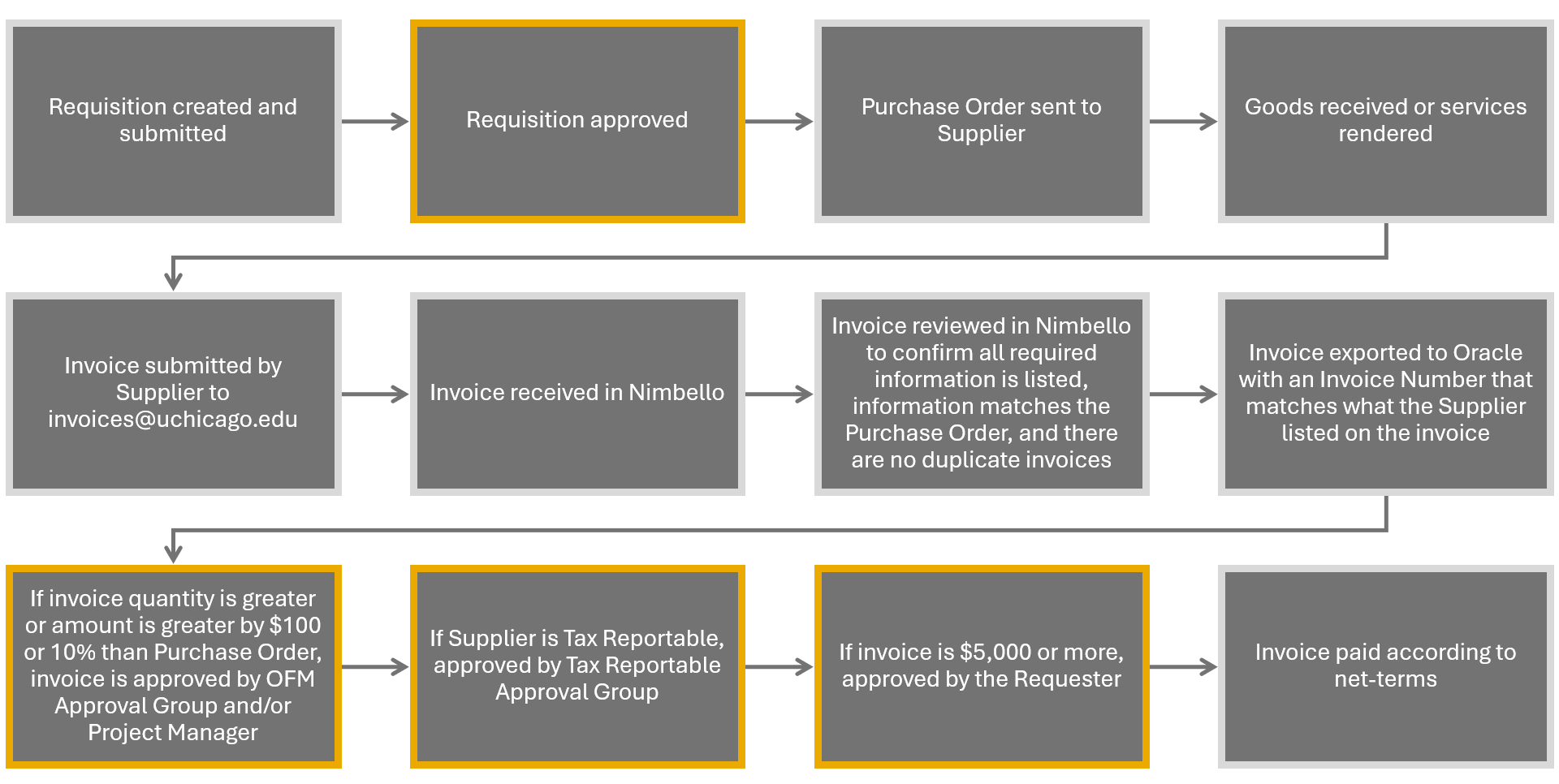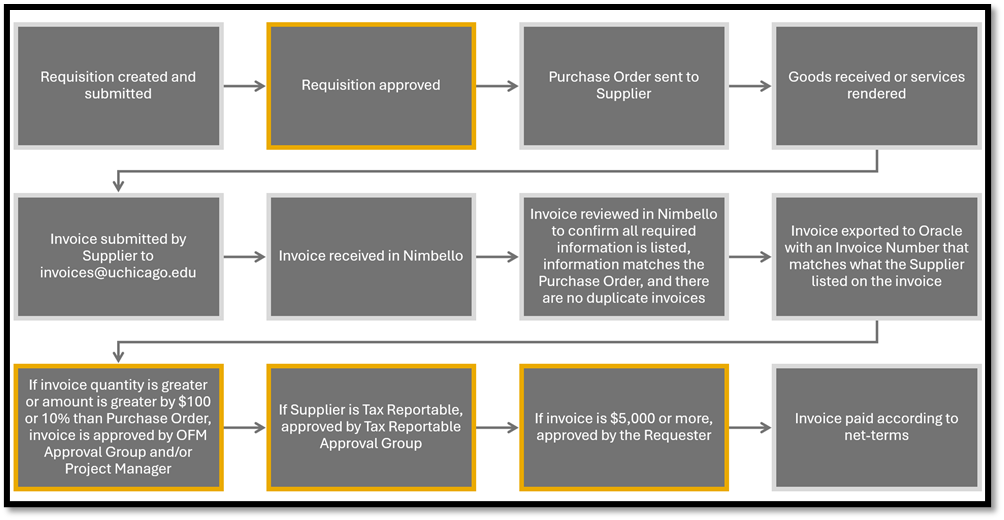 The images below show the invoice workflow. The boxes outlined in yellow are steps that require approval.