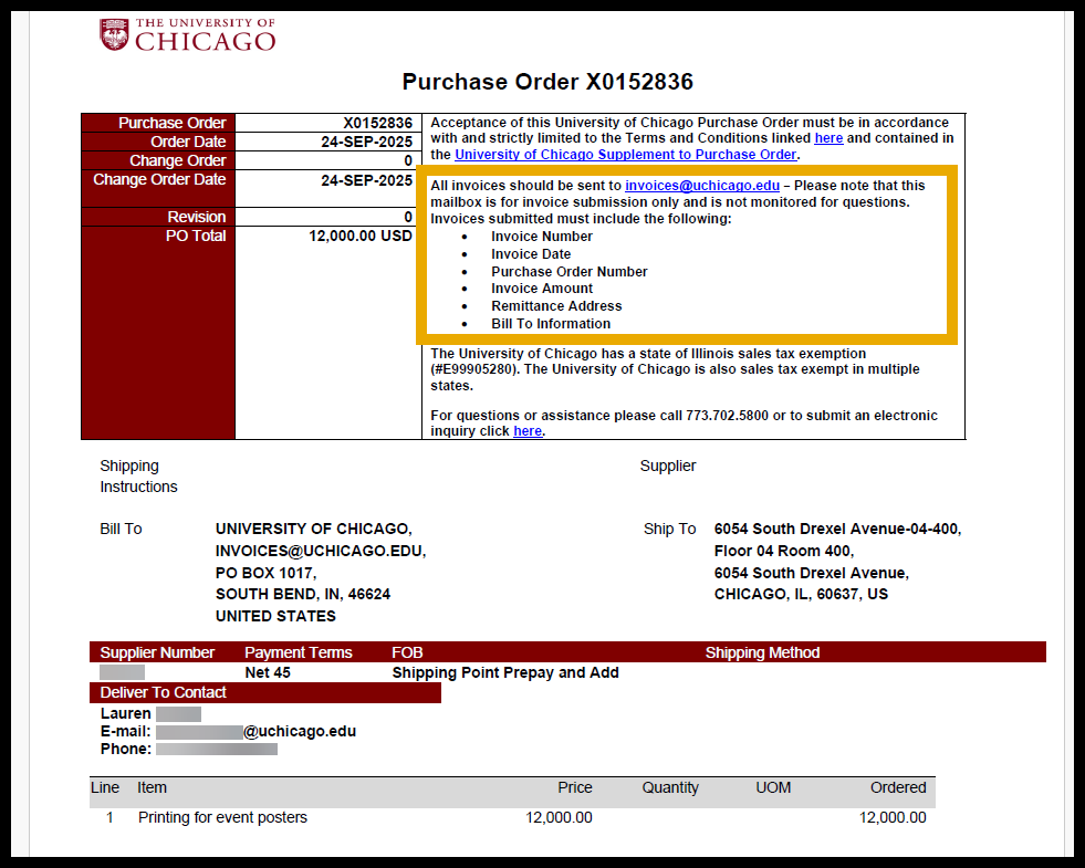 - Suppliers should submit their own invoices to invoices@uchicago.edu.