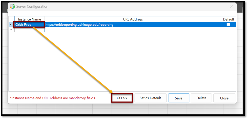 - For the initial setup: Select the Instance Name field and type Orbit Prod, then select the URL Address field and add the following URL - https://orbitreporting.uchicago.edu/reporting.