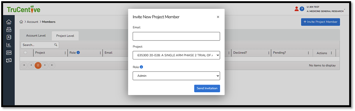 Select the project level tab and the click the Invite Project Member button and enter the user’s email, the project you are inviting them to, and set their role. An email will be sent to the invitee and if they already have access to TruCentive they will receive a notification at the top of the screen indicating that they have been invited to the project where they can choose to accept or not.
